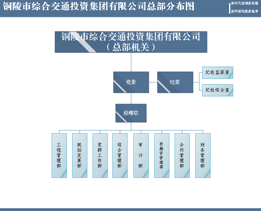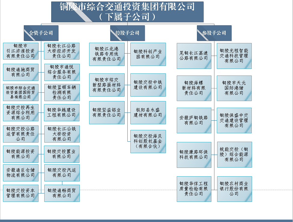 2017年8月18日,市委、市政府立足一江兩岸發(fā)展新局面,決定在原市交投公司整體劃轉(zhuǎn)新體基礎(chǔ)上組建集全市交通基礎(chǔ)設(shè)施項(xiàng)目投融資、開(kāi)發(fā)建設(shè)和運(yùn)營(yíng)管理、參與項(xiàng)目謀劃工作為一體的綜合交通投資集團(tuán)有限公司。注冊(cè)資本金109.77億元人民幣,企業(yè)主體信用評(píng)級(jí)“AA”等級(jí),擁有全資子公司18家,控股公司10家,參股公司11家,是由銅陵市人民政府出資的市屬國(guó)有企業(yè)。