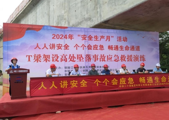 6月25日下午,江北港鐵路專用線有限責(zé)任公司聯(lián)合中鐵建長江(銅陵)港鐵建設(shè)運營有限公司,在江北港鐵路專用線項目黃泥河特大橋68#墩附近舉辦T梁架設(shè)高處墜落事故應(yīng)急演練。本次演練由江北港鐵路專用線公司董事長、總經(jīng)理張葉來擔(dān)任總指揮,中鐵二十局項目經(jīng)理部安全總監(jiān)鐘健任現(xiàn)場指揮,廬江縣應(yīng)急管理局總工程師顧德祥、廬江縣發(fā)改委總工程師朱雷、泥河鎮(zhèn)人民政府黨委副書記高磊受邀蒞臨現(xiàn)場指導(dǎo)點評。江北港鐵路專用線公司安全質(zhì)量部、工程管理部,上海先行項目監(jiān)理部,中鐵十六局、中鐵二十局項目經(jīng)理部相關(guān)人員參加活動。