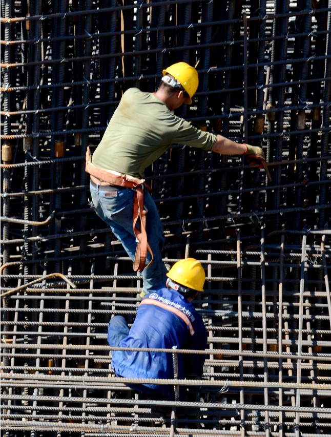焊花飛舞、機器轟鳴,上午6時不到,鋼筋綁扎工劉友勇就和工友穿梭在“鋼筋森林”中。在下游側承臺9米多高的作業平臺上,劉友勇像蜘蛛人一樣緊貼著剛捆扎好的“樹干”,正在綁扎南主墩塔座鋼筋。承臺上沒有任何遮擋,劉友勇和工友們完全暴露在烈日下。雖然天氣很熱,但幾乎所有鋼筋工都戴著厚厚的手套,不少人的手套甚至還磨破了。“現在這時候,鋼筋表面溫度有六七十攝氏度。不戴手套拿不了鋼筋,很燙的。”劉友勇一邊笑著,一邊抓住滾燙的鋼筋,嚴格按照圖紙尺寸和間距,一根一根地將鋼筋綁扎固定起來。由于長時間觸摸滾燙的鋼筋,他的手套一直處于被汗水濕透的狀態。