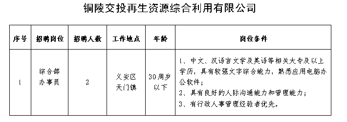 因業務發展需要,我公司司屬公司銅陵市綜交新型路面材料有限責任公司、銅陵交投再生資源綜合利用有限公司現面向社會公開招聘若干名工作人員,具體事項公告如下: