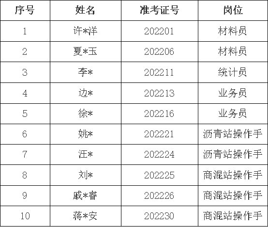 根據(jù)2022年9月29日發(fā)布的《銅陵市綜交新型路面材料有限責(zé)任公司招聘工作人員公告》的規(guī)定,現(xiàn)對擬錄用人員進(jìn)行公示,名單如下: