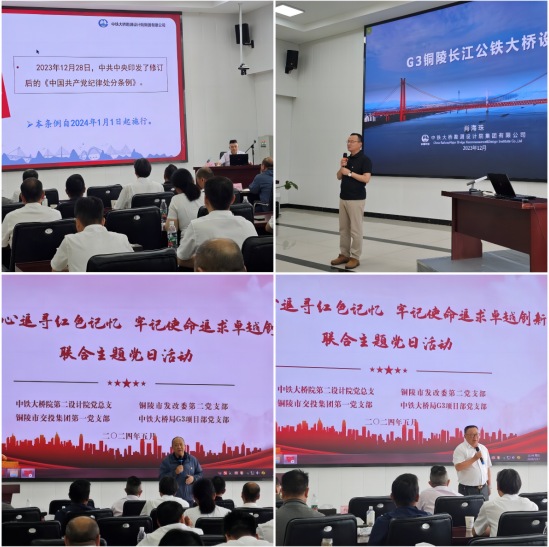 現(xiàn)場(chǎng)參觀過后,在G3大橋項(xiàng)目部會(huì)議室,中鐵大橋院黨建工作部部長(zhǎng)劉建軍、中鐵大橋院總工程師、G3銅陵長(zhǎng)江公鐵大橋總設(shè)計(jì)師肖海珠分別以《中國(guó)共產(chǎn)黨紀(jì)律處分條例》解讀、斜拉懸索協(xié)作體系橋設(shè)計(jì)為題作了輔導(dǎo)講座,并與聯(lián)合單位進(jìn)行了交流探討。集團(tuán)公司黨委副書記方勁松、中鐵大橋局G3項(xiàng)目部經(jīng)理劉幸福參與交流。