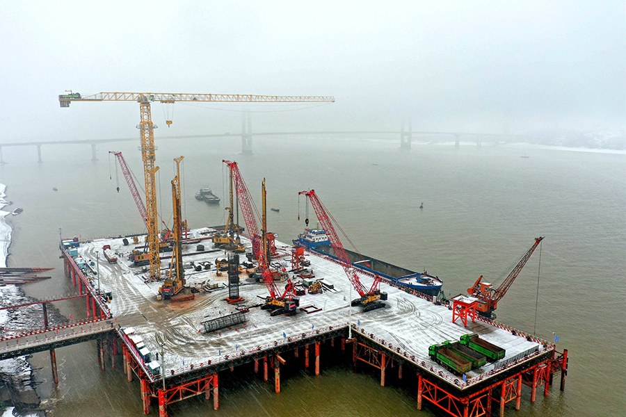 人民網合肥2月9日電(陳浩)虎年上班首日,安徽銅陵出現降雪天氣,但建設者的熱情沒有絲毫減弱。為確保G3銅陵長江公鐵大橋建設進度,施工人員頂風冒雪為大橋3號主墩安裝鉆孔樁鋼筋籠。
