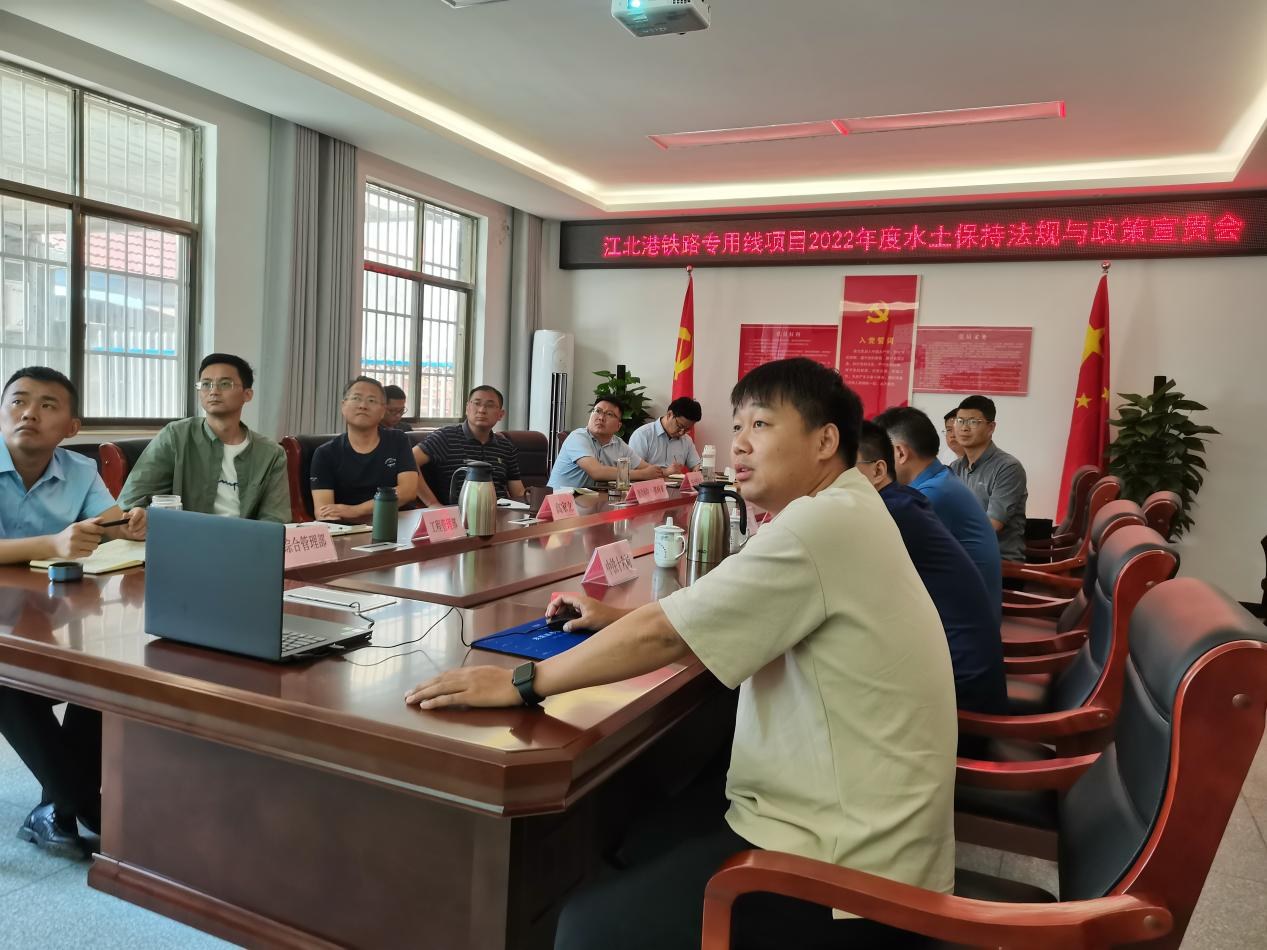 為提高全體參建單位水保法律法規意識,扎實有序推進項目建設期水土保持管理工作,6月9日上午,江北港鐵路專用線公司組織召開項目2022年度水土保持法規與政策宣貫會。公司副總經理高家立主持會議。集團公司總工程師,江北港鐵路公司董事長、總經理張葉來,公司部門相關人員、十六局項目經理部、上海先行項目監理部相關人員出席會議,二十局項目經理部以視頻方式參會。